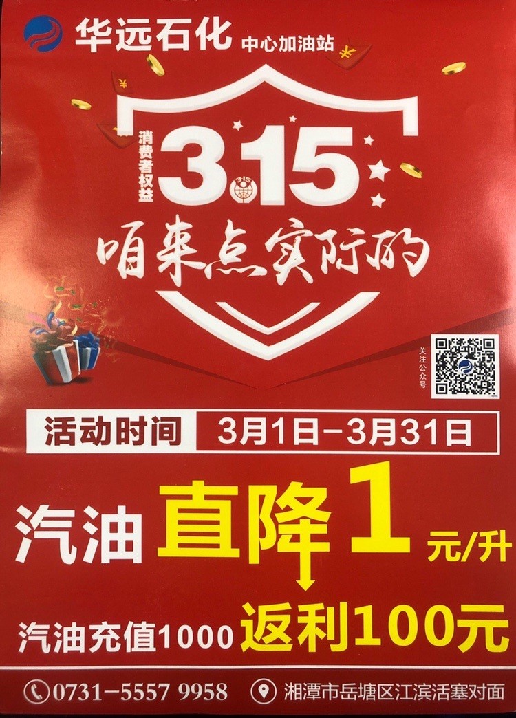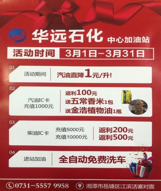 2020年3月疫情得到控制以后,湖南華遠(yuǎn)石化有限公司響應(yīng)政府號召,支持湘潭市各企業(yè)開展復(fù)工復(fù)產(chǎn)工作,在湘潭市中心加油站率先推出油品單價掛牌價直降1元的優(yōu)惠活動,讓利社會,回報大眾。另外持華遠(yuǎn)石化加油卡充值優(yōu)惠返利10%,活動時間3月份,長達(dá)一個月,此外充值還贈送東北五常大米,金浩茶油等基本生活物資。