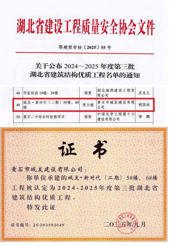 近日,黃石市城發(fā)建設有限公司承建的城發(fā)·新時代(二期)項目喜獲殊榮,被認定為2024至2025年度第三批湖北省建筑結構優(yōu)質工程和2025-2026年度第一批湖北省建筑工程安全文明施工現(xiàn)場。這一成就不僅彰顯了項目部的卓越管理能力,更標志著城發(fā)建工集團在打造高品質人居標桿的道路上邁出了堅實一步。